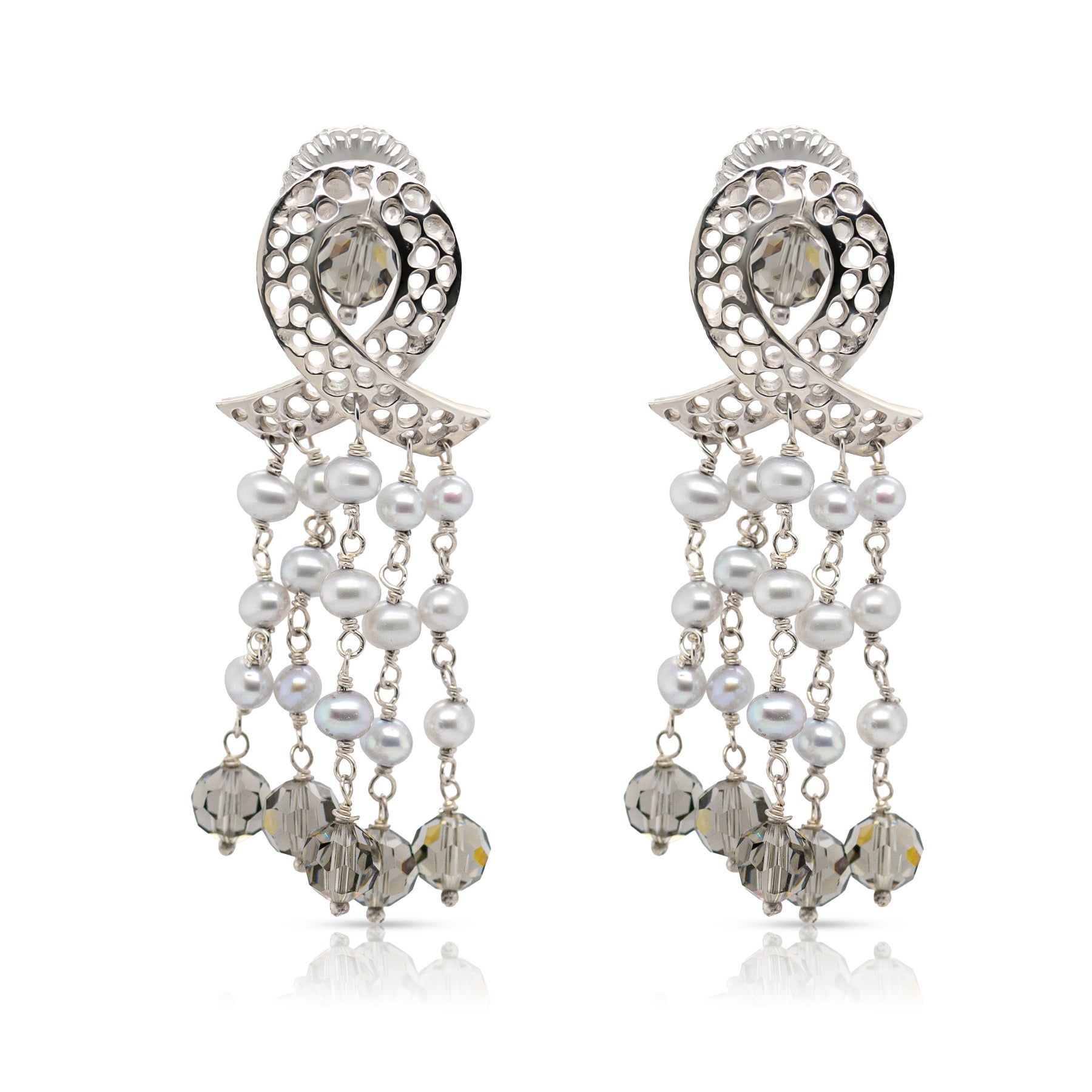 925 Sterling Silver Ribbon, Braided Pearls and Smoky Quartz Swarovski Cascade Earrings